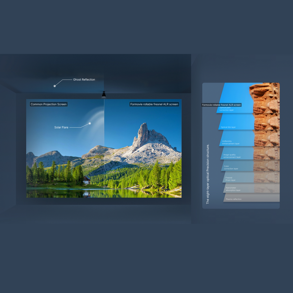 Experience vivid visuals with the Formovie Fresnel Ultra-thin ALR Projection Screen.